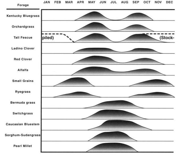 All of these grasses in most Virginia summers experience what is called summer slump. The heat and dry conditions are just too much for them and they shut down until conditions improve. Some more than others. Everything is still simple so far except that we don’t have any summer grass yet. We will get there later. Refer to the chart below taken from Controlled Grazing of Virginia’s Pastures for a graphic representation of what we have discussed so far.