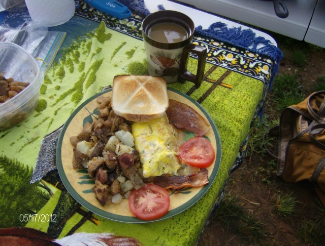 Breakfast the first day was so good that we did the same thing again the second day. It was even better because we remembered to slice a tomato for breakfast. We had a hot dog left over from dinner so Stewart sliced that up and added it to the morning potatoes. We did not have any sausage gravy the second day. We had sausage but decided that too much of a good thing might spoil us so we just finished off the bacon.