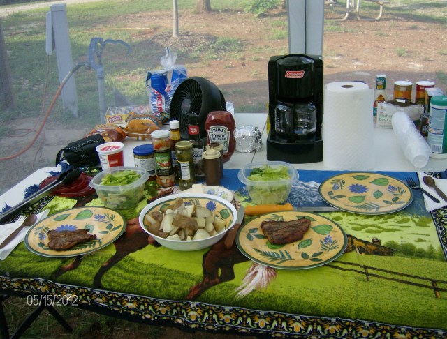 We washed up a little and then began supper preparations. I think Stewart and I both surprise each other at how well we cooked and managed to get things done together. For the first evening meal I grilled Steaks and made a fresh garden salad with mixed lettuce I grew here and Stewart fixed potatoes with butter and sour cream and chopped up green peppers and onions for the salad.