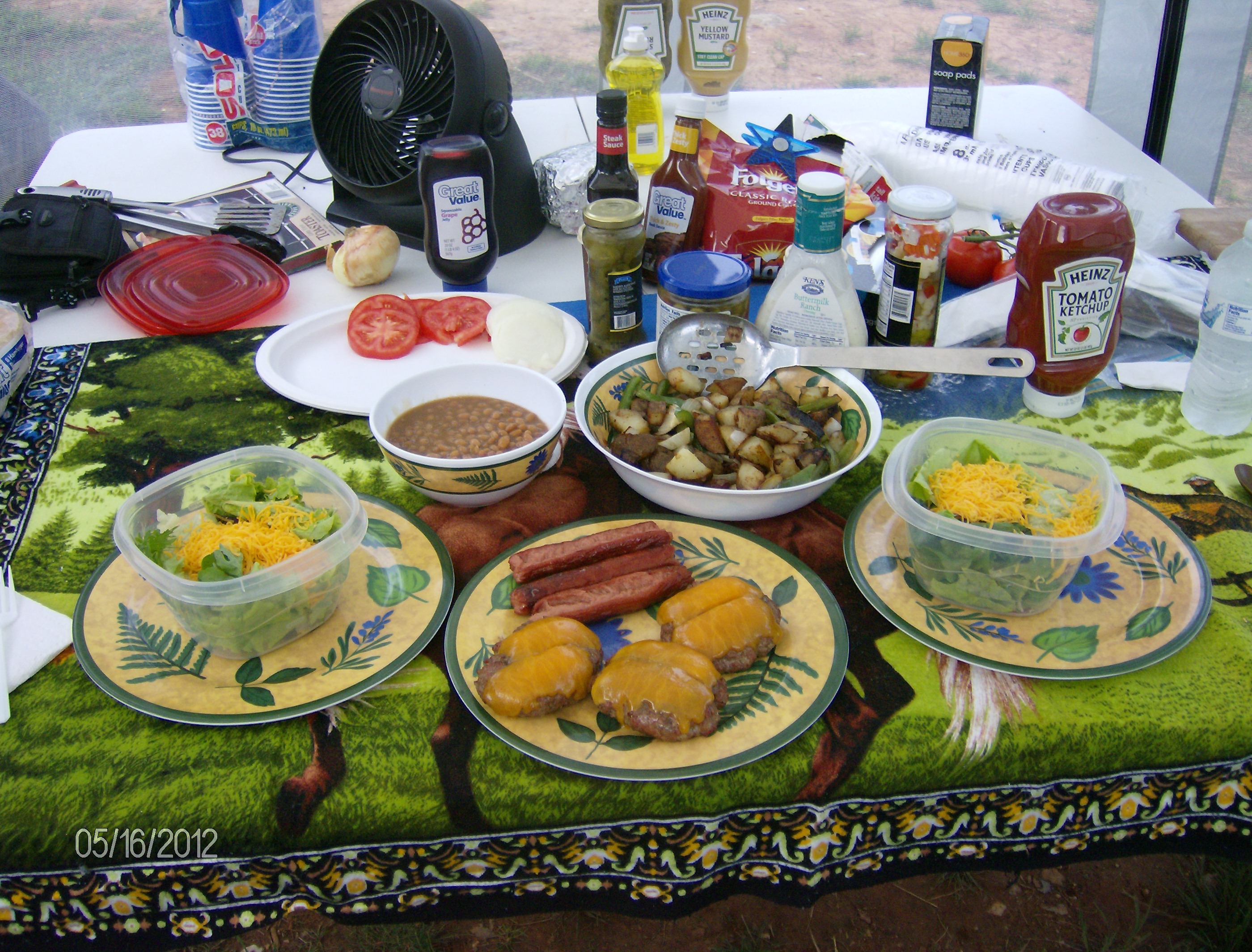 Arriving back in camp we went through what was becoming our routine. Cared for the horses and cleaned up a little and then started some supper. Cheeseburgers and Hot dogs with all the fixings, baked beans, fried potatoes with green pepper and onions, fresh garden salad with Kens buttermilk dressing and a couple of golden beverages. That cheeseburger with good cheese and tomato and onion was delicious.
