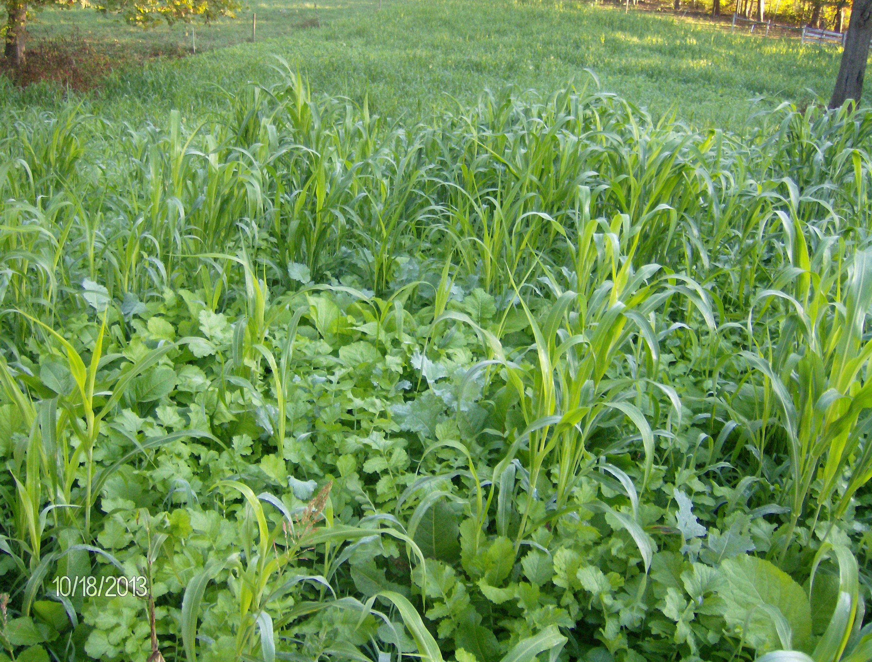 below is a photo of what has become my all star cover crop plot….this is the plot I sowed on Labor Day week end. The tall stuff is a combination of new seedlings and regrowth from the millet and sorghum sudan that was grazed and mown before new seeding. The frost predicted this week will add it to the biomass for the field.