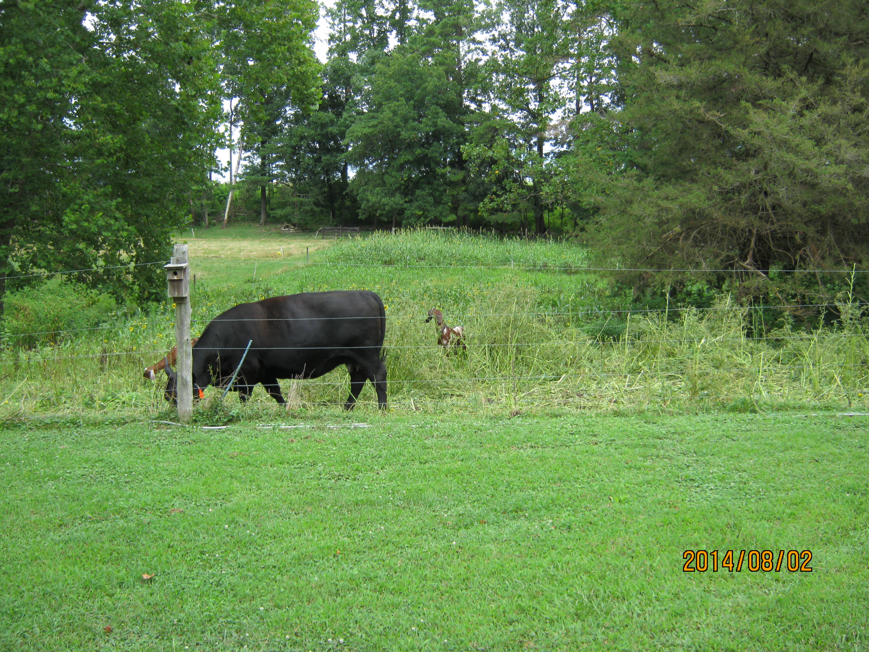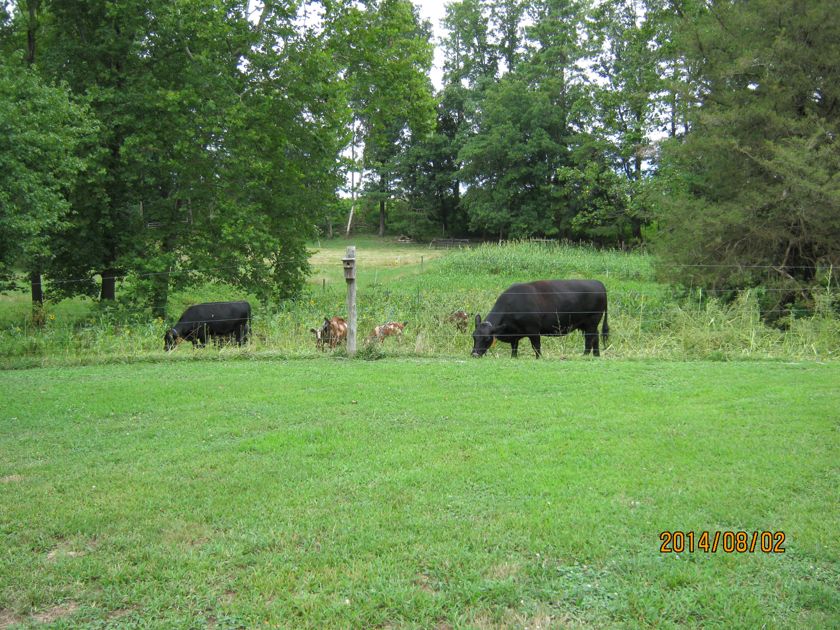 Thursday evening when I got home my cow neighbor called and had an unexpected birth….having lost the last calf a few weeks ago to an unknown predator, as the cows are in an isolated field way back beyond my house: he was duly worried. We decided to get the cow and calf to my place for the night and he would move them the next day. All went well until the calf ducked into the summer cover crop strip that was six feet tall….We looked and looked….neighbor was concerned…finally I turned his mama cow and my three into the strip along with the goats….they eventually found the calf….