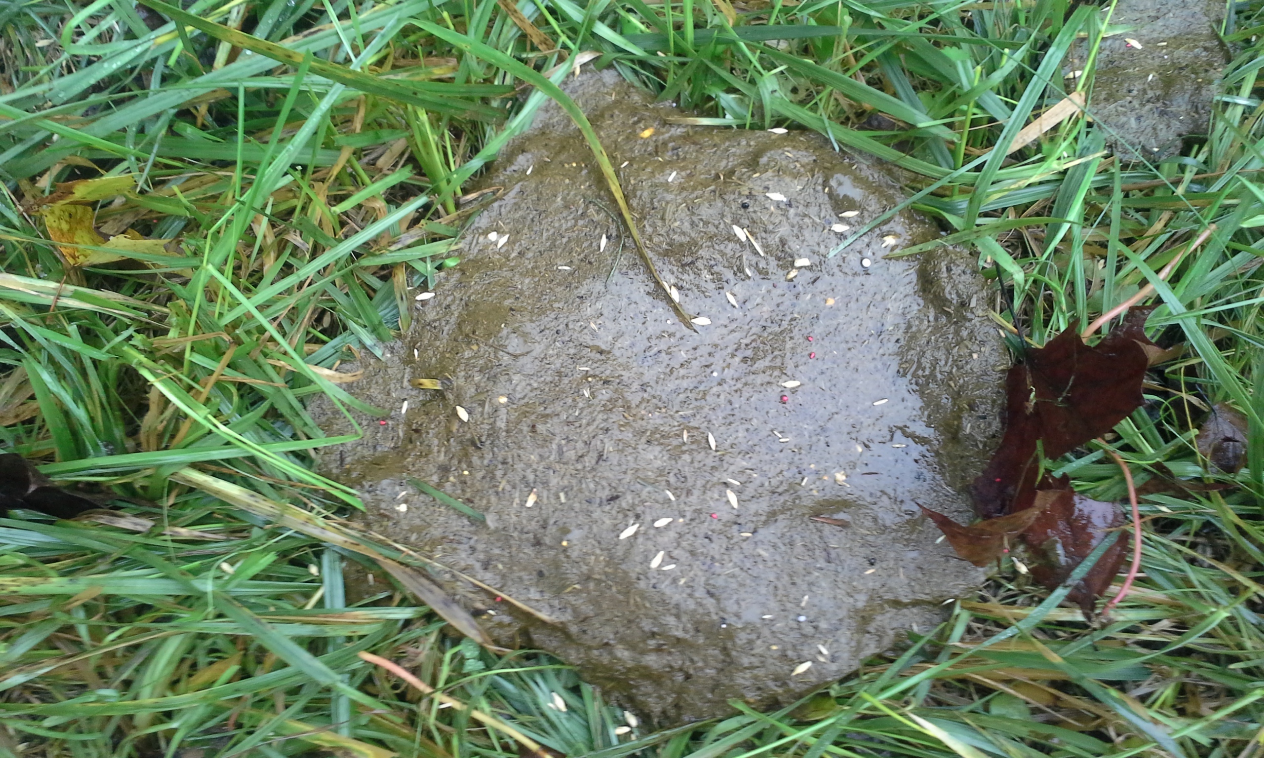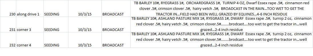 final photo of seed on a cow pie….here I can easily see in the photo …barley, ryegrass and or orchardgrass and two kinds of clover…the rape and turnip are too tiny to see and the vetch always hides from me but it comes up…it is one of my favorite fall planted cover crops….Actually I am looking forward to spring,,,,almost every lot has been sprinkled with Crimson Clover and hairy vetch and dwarf essex Rape…there have been smatterings of other things in some mixws…turnips and radishes primarily…but it is too late for radishes to do much now…..but when those three that are everywhere bloom in the spring this place is going to be beautiful….it will be painted in green and crimson and purple and transition to the golden yellow of the rape, with smatterings of white flowers…and all of them great soil builders….then the red clover will take over in the early summer with its pink blossoms.
