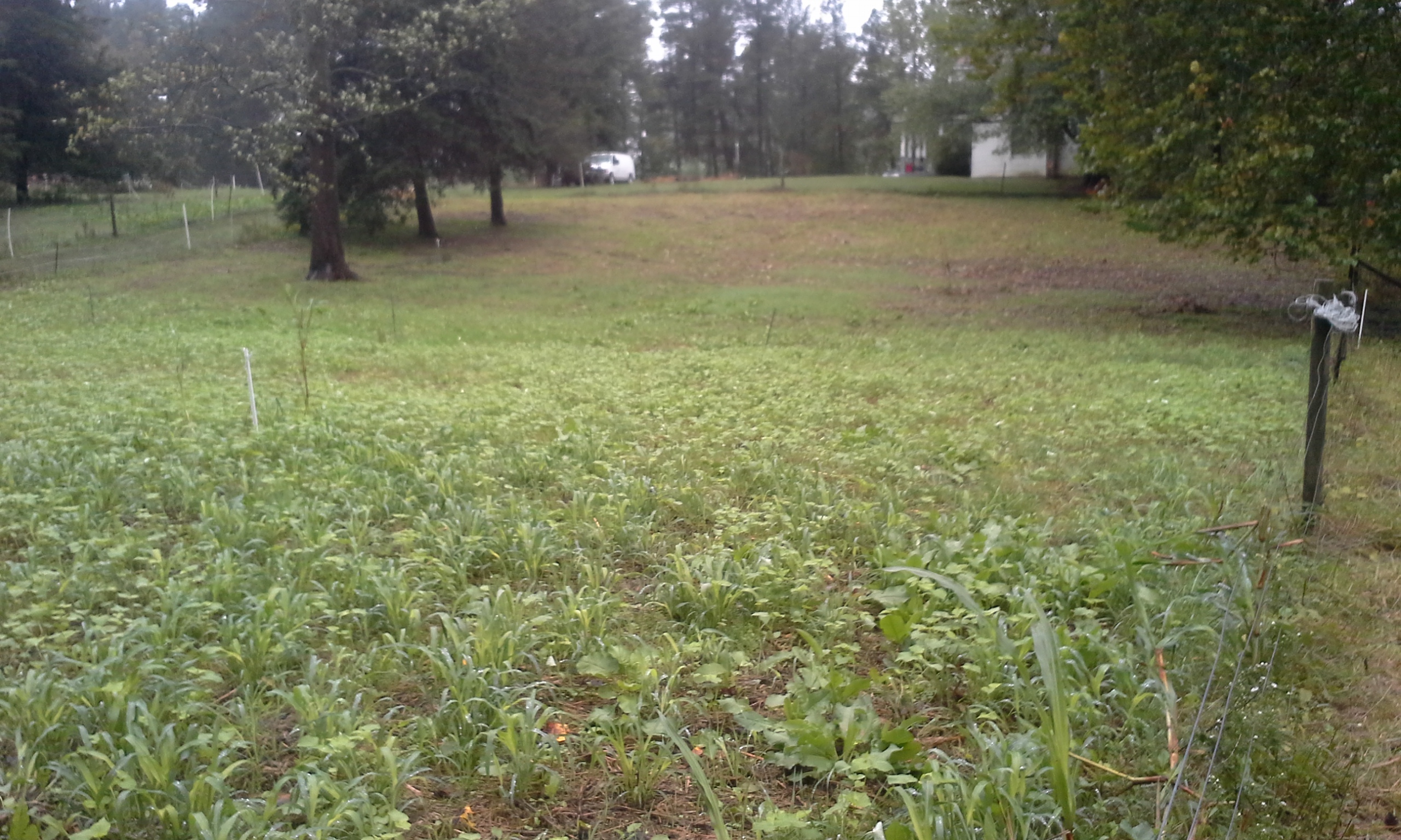 My later planted summer cover crops did not do very well….the early planted ones were terrific…I have been planting cool season cover behind the grazing since late August and with the recent rain they are finally beginning to come up….I feared that most of them had just fed the birds…but everything appears to have some of the new species showing….