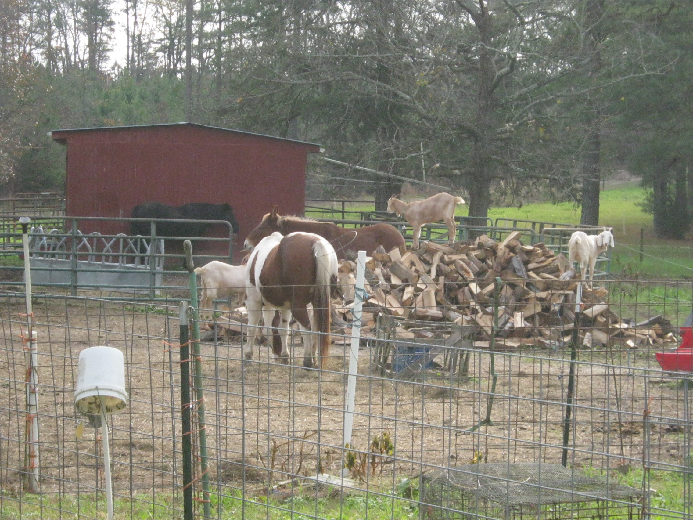 Below is a shot from Sunday morning. I grabbed the camera because when I came out of the house Dixie and Corona were rubbing noses….but by the time I got the camera out and turned on they had stopped. Dixie is the sorrel Mule…Corona is the tan goat on top of the wood pile. I had to sneak behind the car to even get a chance at a shot because if Dixie had seen me she would have come to the fence looking for a handout….the goats love to hang out with the horses and I think they feel safe with them…Condi is the most temperamental of my equines and she is the boss mare….but it is not uncommon to find four or five goats laying around her in her stall…just not at feeding time…
