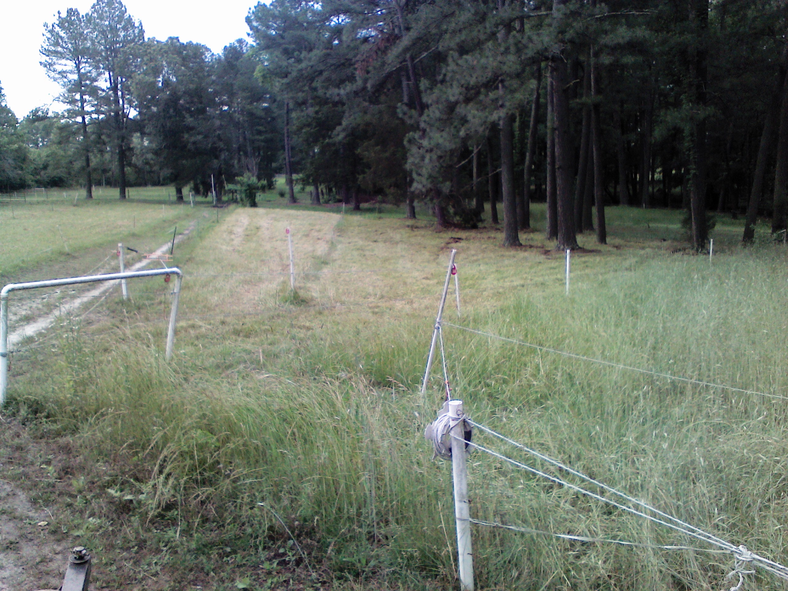 and below is the high tech fence…….horses honor it fine…..in fact when Pete goes into a new paddock he walks around the perimeter to find the fence which is a single hot poly wire or poly tape or poly rope…..I use them all…..I have over 42 paddocks and experiment with fence…..as long as it has 4500 volts on it horses and cows will honor it…..the goats will walk under the division fences but they wont get far from the equines…..they feel safe with the horses and the mule