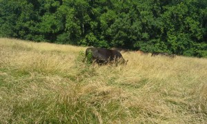 We rode the whole wooded loop at Powhatan. We stopped one time near the old chimney where there was a bench to use for a mounting block and rested for a few minutes and then we mounted up and finished the loop. He is now busy planning our next ride. Condi had her shoes replaced this morning and Dixie acquired a new set all the way around.